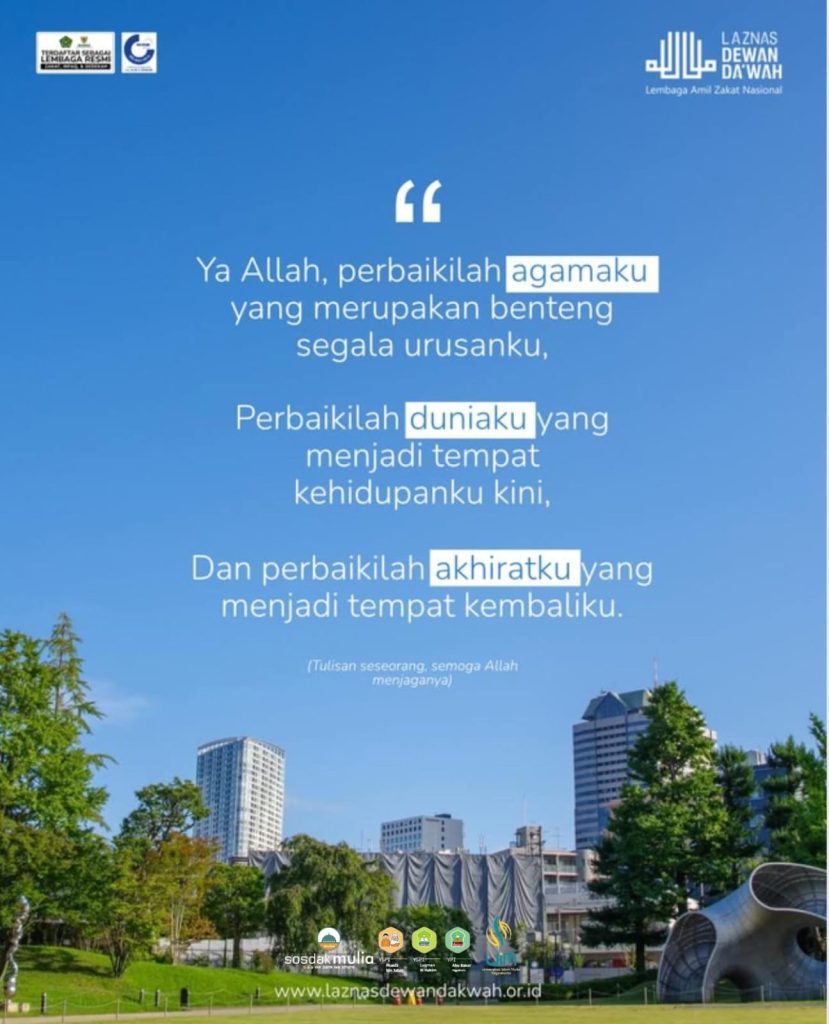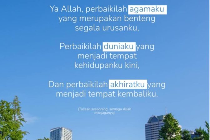 “Ya Allah, perbaikilah agamaku yang merupakan benteng segala urusanku, perbaikilah duniaku yang menjadi tempat kehidupanku kini, dan perbaikilah akhiratku yang menjadi tempat kembaliku.”