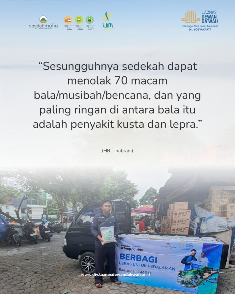 “Sesungguhnya sedekah dapat menolak 70 macam bala/musibah/bencana, dan yang paling ringan di antara bala itu adalah penyakit kusta dan lepra.” (HR. Thabrani)